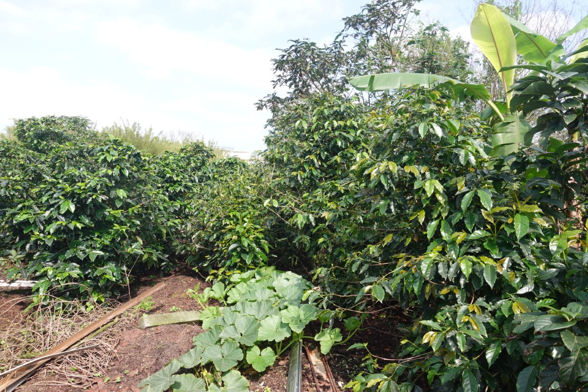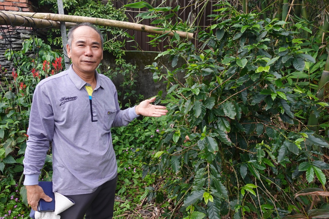 此外,他曾利用廢棄的鋁鋼材在田區搭棚架,幫咖啡防曬。但棚架被颱風吹壞後,他在咖啡旁種植較高大的香蕉、酪梨,或是將咖啡種在竹林下,為植株提供遮陽和阻擋風勢。