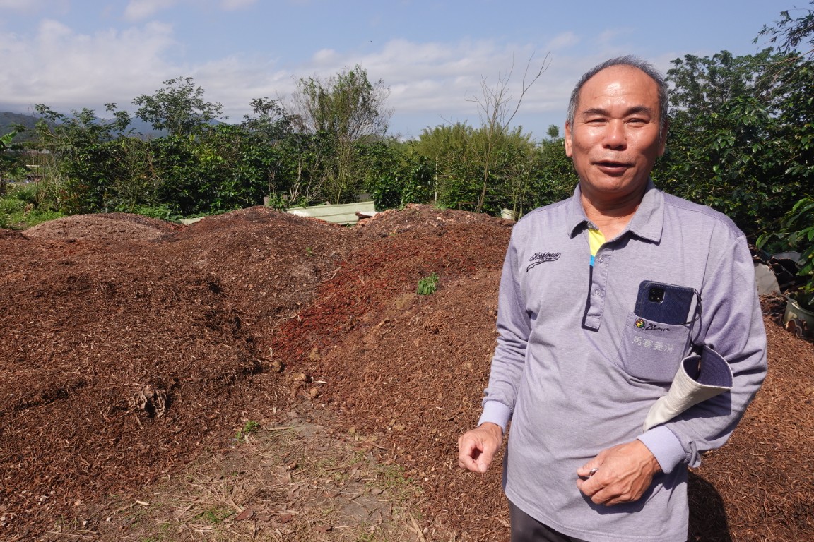 咖啡樹長大後,他開始跟附近的中藥廠購買大量中藥渣,堆放3~6個月完成發酵,再往田裡鋪上厚厚一層,既能幫土壤保濕、避免水分蒸散,又能減少雜草蔓生;而中藥渣裡的養分如胺基酸,也有助於促進植株生長、滋養咖啡風味。