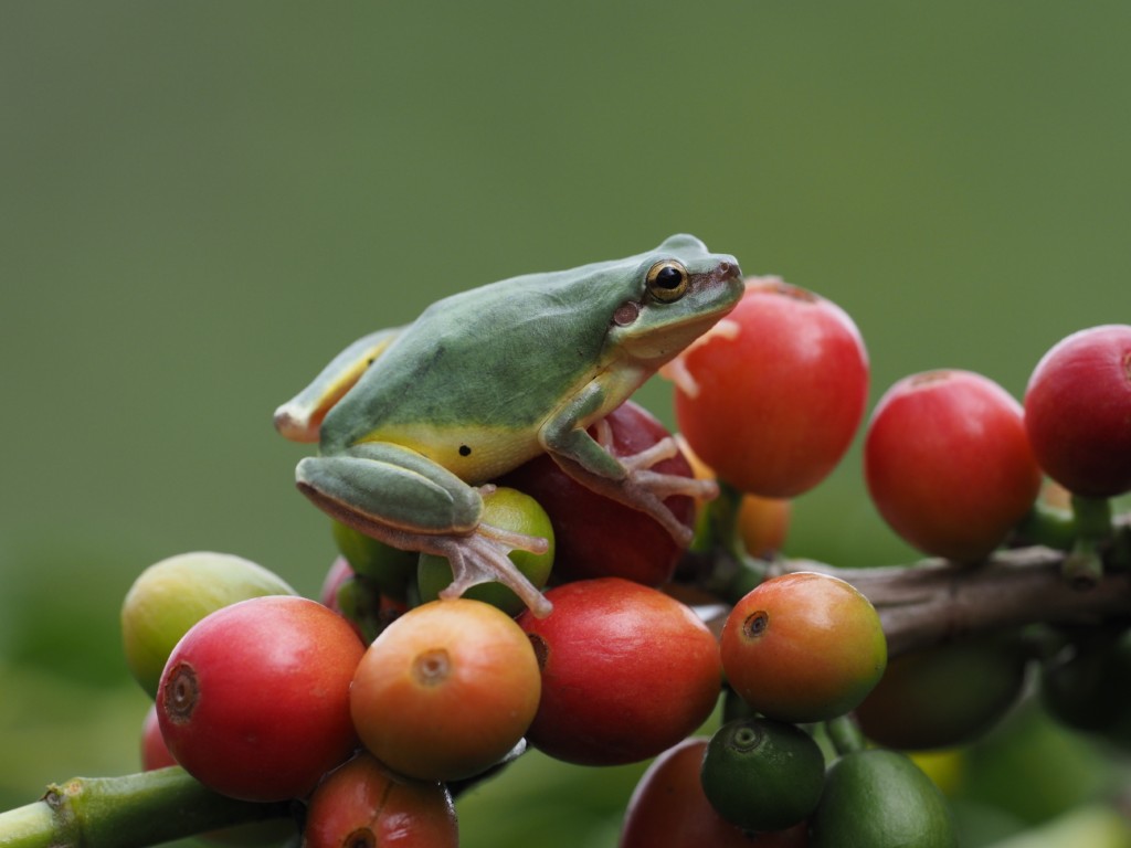 即便如此,化學碩士出身的程朝棟仍持續在農場發揮實驗精神,最終找到相對適合在宜蘭種植的咖啡品種,同時以有機農法積極養土,運用微生物協助植株生長與病蟲害防治。在友善環境的堅持下,農場吸引了別名雨怪的中國樹蟾前來定居,這種對生存環境極為挑剔的可愛生物,也因此成為農場施行有機農法有成的重要象徵。